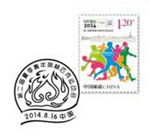 中国邮政定于2014年8月16日发行《第二届夏季青年奥林匹克运动会》纪念邮票1套1枚,面值1.20元。