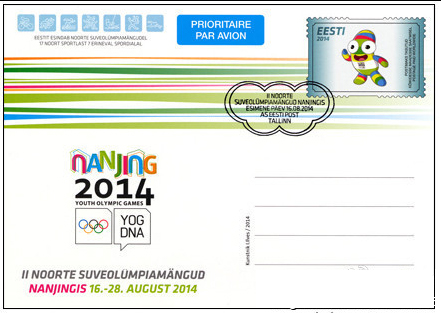 为庆祝第二届青年奥运会在南京召开爱沙尼亚邮政近日发行邮资明信片一枚,邮资图为本届青年奥运会吉祥物:雨花石砳砳。邮资片左下角图案为本届青奥会会徽。为配合这枚邮资片的发行,爱沙尼亚邮政还于发行首日启用纪念邮戳一枚。
