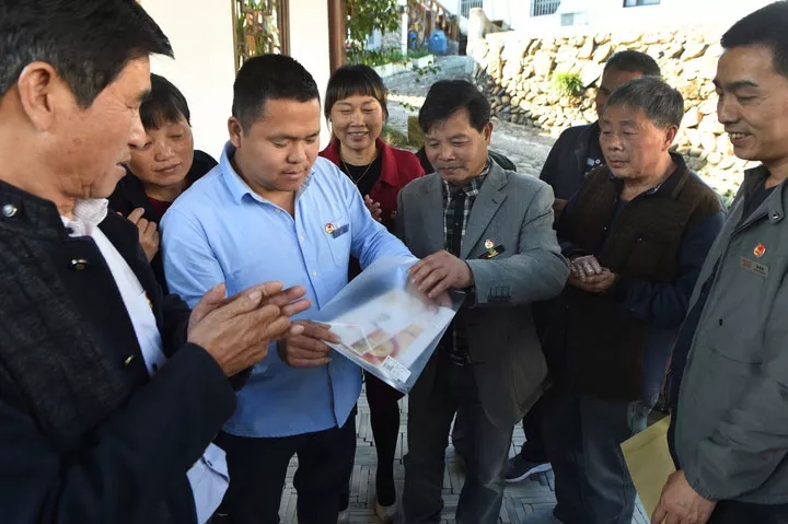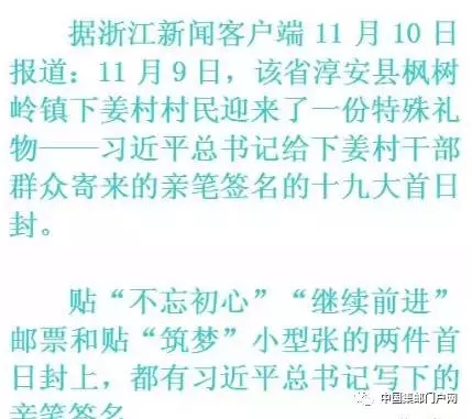 【要闻】总shu记签名首日封实物图今日首次披露(之前只有报道没有图片) 日期:2017-11-14 2017-11-14 中国集邮门户网 11月9日,浙江省淳安县枫树岭镇下姜村,秋阳朗照,层林尽染。这一天,下姜村村民迎来了一份特殊的礼物 下姜村村民在村口争相传看寄来的首日封
