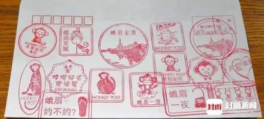 灵猴邮局内部,灵猴主题也十分抢眼,从灵猴公仔到灵猴明信片,从灵猴纪念封到灵猴造型U盘……各种灵猴主题文创产品应有尽有。灵猴主题之外,还有一系列峨眉山主题的邮品和文创产品。而邮局内的14个主题戳堪称“镇局之宝”,全部为峨眉山或灵猴元素,引来不少游客尝鲜。