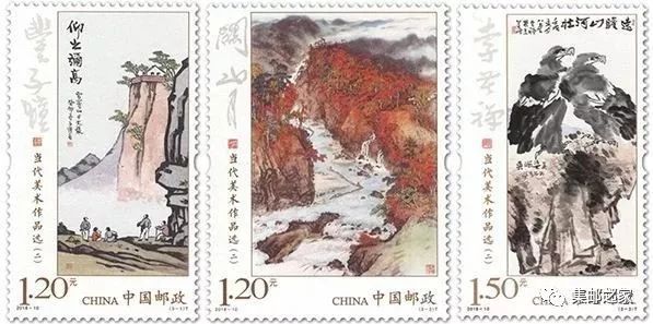 中国邮政定于2018年5月11日发行《当代美术作品选(二)》特种邮票1套3枚。详情如下:志号:2018-10 图 序 图 名 面 值(3-1)T   丰子恺《仰之弥高》 1.20元(3-2)T   关山月《秋溪放筏》 1.20元(3-3)T   李苦禅《远瞻山河壮》 1.50元邮票规格:一、三图:30×50毫米 二图:38×50毫米齿孔度数:一、三图:13.5度 二图:13×13.5度整张枚数:版式一 16枚 版式二 4枚整张规格:版式一 :一、三图 146×240毫米 版式一 : 二图 180×240毫米     版式二 :120×150毫米版  别: 一图 胶雕套印 二图 胶印 三图 影写防伪方式:防伪纸张、防伪油墨、异形齿孔、荧光喷码设 计 者:史渊原画作者:一图 丰子恺二图 关山月三图 李苦禅一图雕刻者:刘明慧责任编辑:干止戈印 制 厂:北京邮票厂