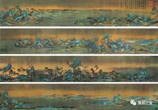 《千里江山图》表现了绵亘山势,幽岩深谷,高峰平坡,流溪飞泉,水村野市,渔船游艇,桥梁水车,茅蓬楼阁,以及捕鱼、游赏、行旅、呼渡等人物的活动。作者以“咫尺有千里之趣”的表现手法和绝妙的笔法,描绘了祖国的锦绣河山。这些内容也将在邮票中得到充分的展示。然而今天,小编想和大家聊一聊这幅古画画面之外的故事。