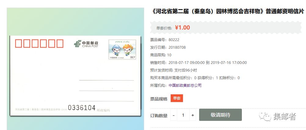 集邮者讯,中国邮政定于2018年7月8日发行《河北省第二届(秦皇岛)园林博览会吉祥物》普通邮资明信片1套1枚,一直有邮友问集邮哥为什么没有网厅销售。