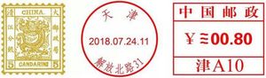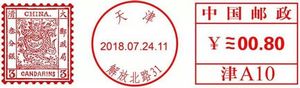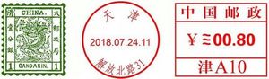 天津首次启用彩色邮资机宣传戳 日期:2018-07-25 作者:张俊伟 来源:中国集邮报 7月24日,天津邮政为纪念大龙邮票发行140周年专门推出的一套彩色邮资机宣传戳。该套邮资机宣传戳共3枚,邮资机宣传戳采用大龙邮票1分银、3分银、5分银为图案,体现了中国第一枚邮票“大龙邮票”的特色。这套彩色邮资机宣传戳是天津首次使用。