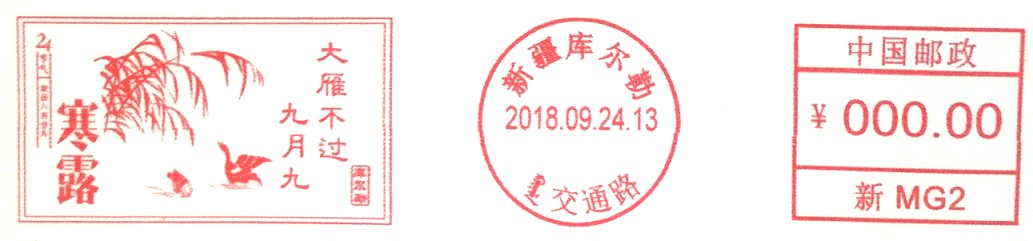 新疆库尔勒10月8日二十四节气-大雁不过九月九-寒露邮资机戳