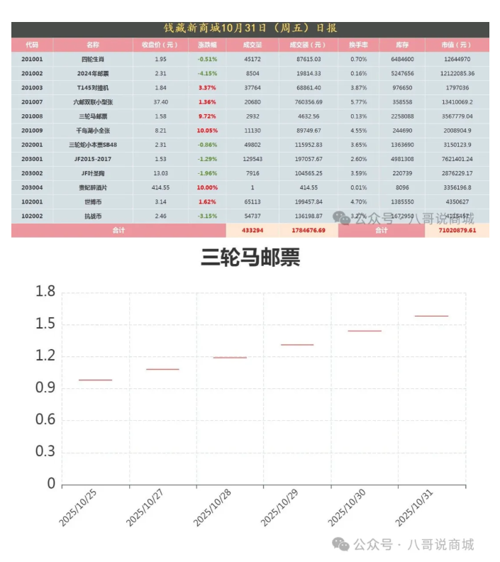 三轮马邮票   涨幅   9.72%  开盘价1.58元   收盘价1.58元    托管户筹码有松动,明年是马年、建议关注