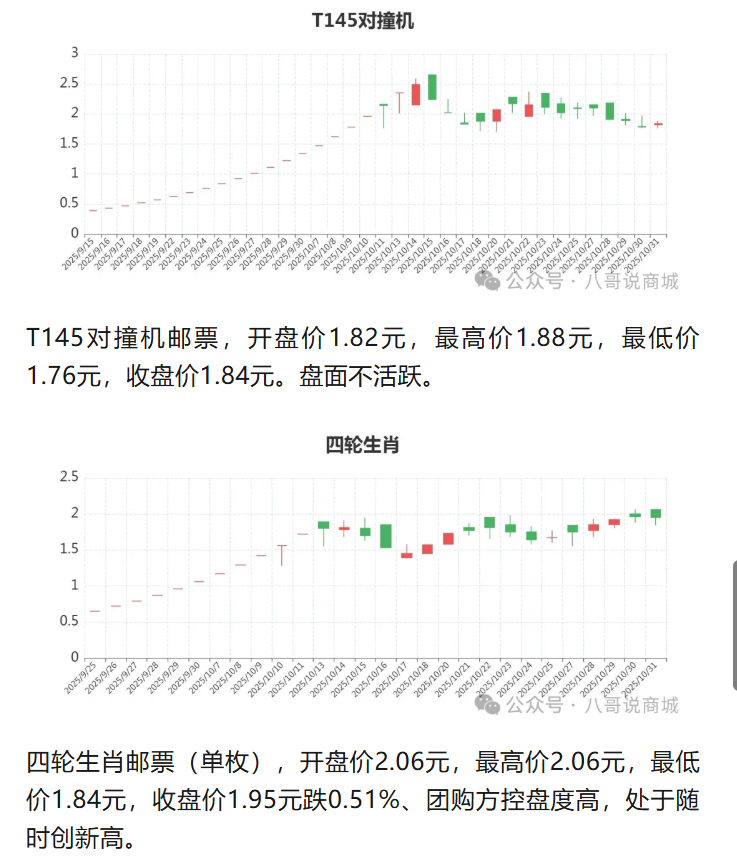 四轮生肖邮票(单枚),开盘价2.06元,最高价2.06元,最低价1.84元,收盘价1.95元跌0.51%、团购方控盘度高,处于随时创新高。