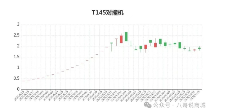 T145对撞机邮票,开盘价1.93元,最高价2.01元,最低价1.8元,收盘价1.89元.涨2.72%