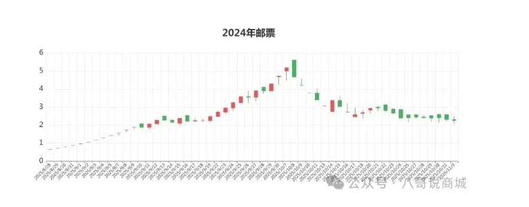 2024邮票,开盘2.31元,最高2.5元,最低2.08元,收盘2.26元.跌2.16%