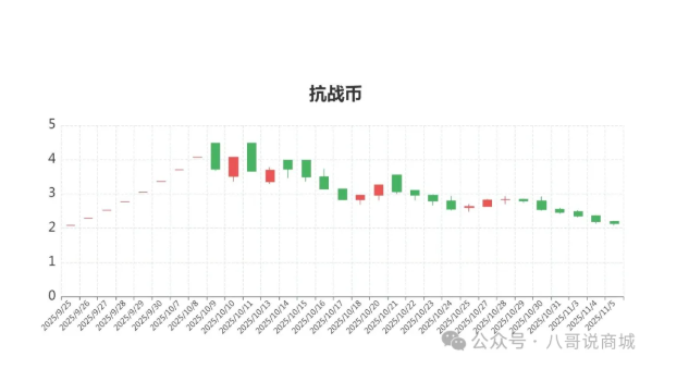 抗战币,开盘2.19元,最高2.21元,最低2.08元,收盘2..13元.跌2.74%