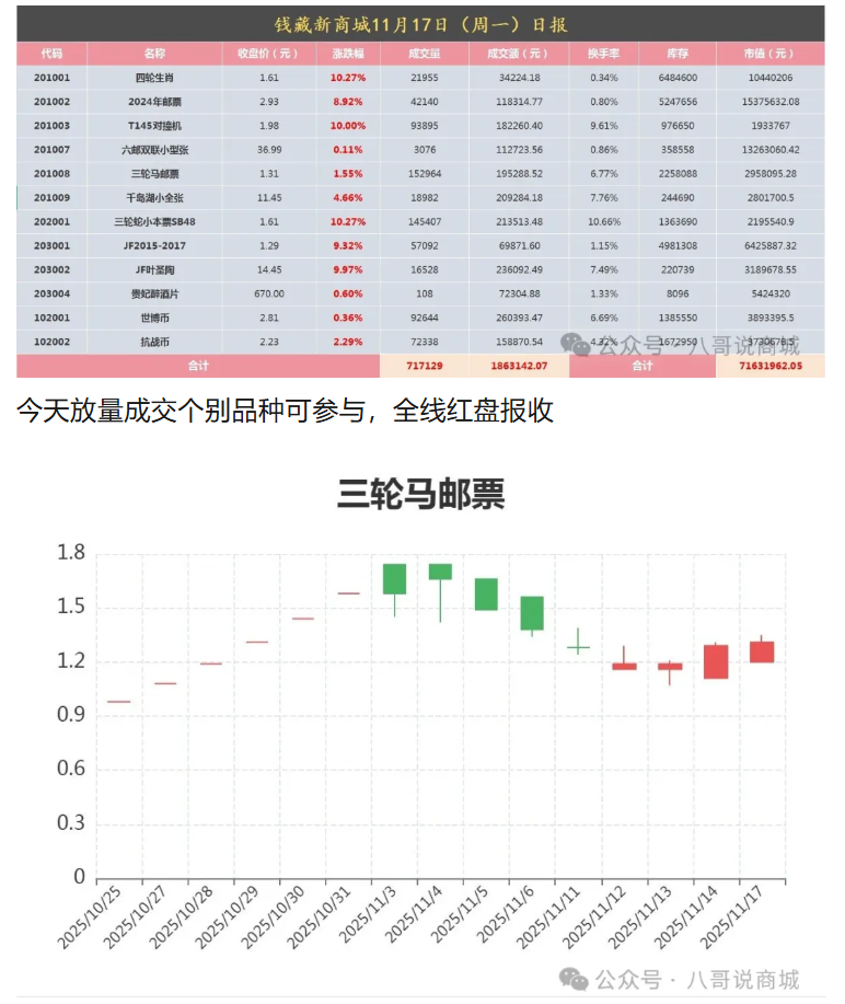 为了大力推广本公众号,凡是转发这个公众号文章到自己的朋友圈+转发(到邮币卡,收藏类,投资类微信群人数有300人以上的一个)并截图发给本人,免费奖励钱藏线上三轮马邮票二枚,总数500枚。