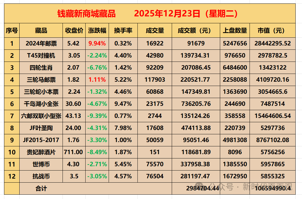 一枝独秀 钱藏走势分化 日期:2025-12-24 来源:新时代面面观 钱藏新商城: 1.2024今天一枝独秀。早盘不到一分钟,2024强势封板。钱藏开盘几个月来,在个票开板的情况下,2024今天开盘即封涨停直到收盘,如此强的走势尚属首次。龙头票后续剧本如何写,值得期待。三轮马到达散户托管成本附近,今天跟随龙头保持红盘,点赞。 2.冲高回落。其他个票基本走的冲高回落的剧本,个股在上周五、周一连续大涨之后,积累了不少获利盘,需要调整消化。 3.社群发出路边社消息,周四可能会有利好消息落地。