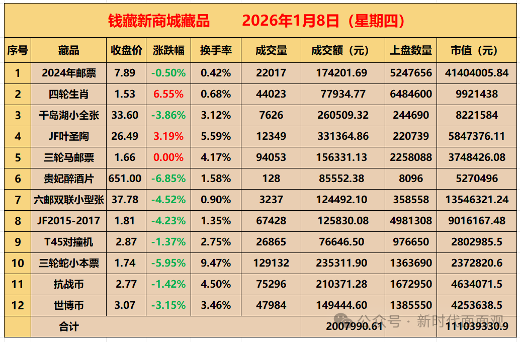 1月8日邮币商城行情速递 日期:2026-01-08 来源:新时代面面观 钱藏新商城: 钱藏今日走势继续分化,涨跌互现。龙头窄幅缩量整理,整体行情乏善可陈。 很多朋友在问,钱藏何时上新。该上还是得上啊。