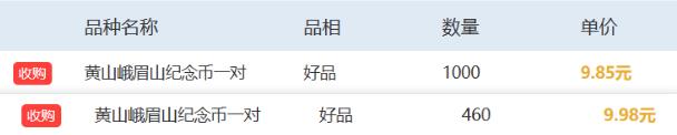 大宗平台上,黄山峨眉山纪念币已有多笔,低于面值成交的情况,市场大环境不好,收藏市场普遍低迷: