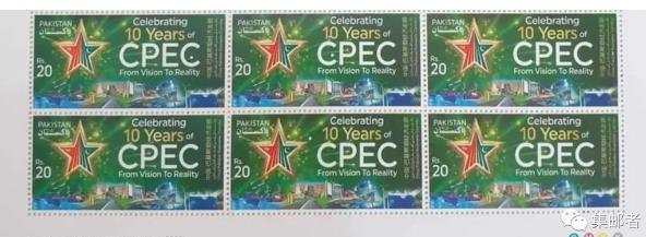 近日,巴基斯坦邮政发行《中国一巴基斯坦经济走廊10周年》纪念邮票1套1枚。图案为一颗放着光芒的金边五角星(此内含中巴两国国旗元素的五角星是中巴经济走廊秘书处徽志的主图),以及代表中巴两国合作的图片,包括港口、高速公路、电站(燃煤、风力和太阳能)及光缆等,票面印有“中国一巴基斯坦经济走廊”(中文、乌尔都文及英文)和“庆祝中巴经济走廊10周年,从愿景到现实”(英文)字样。