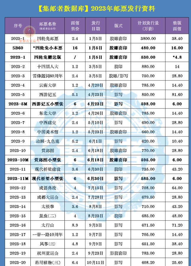 杭州亚运会套票拉高,2023年新邮平均量,药用植物又给拉下来了,目前2023年平均发行量在709.12万套。