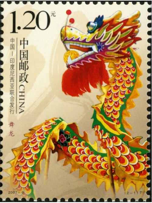 随着时代的发展,老百姓也越来越喜欢龙的形象,并且把它看作能行云布雨、消灾降福的神兽,它的形象频繁出现在民俗活动中。其中与龙相关的民俗文化活动中,最有代表性的便是舞龙。中国邮政发行的带有舞龙形象的邮票非常多,其中第1次出现舞龙形象的是中国邮政在1959年9月25日发行的《人民公社》特种邮票第11枚(174)《文娱生活》,背景画面展示的是当时活跃在广大农村的各种文体活动,其中就有舞龙。2007年4月13日,中国与印度尼西亚联合发行1套2枚的《舞龙舞狮》特种邮票,其中邮票第1图(见图)便是中国的“舞龙”。