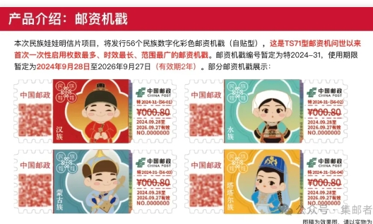 今天一起回顾下,从邮资标签,到限编个票,再到邮票数藏,希望且行且珍惜... 机戳如前几年的自贴型的邮资机戳出来后,全国各地都疯狂发行,估计现在有几万个品种了吧。目前全套数字最多应该是下面这个56个民族的彩色邮资机戳吧...品种越来越多,关注度也越来越低了!这个圈内人都玩的少,更不要说出圈了...