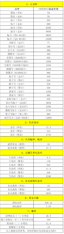 小龙钞、龙币、京剧币、东北虎豹币12月23日行情