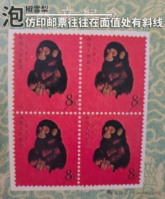 这枚小全张上的猴票如此逼真,却没有加印斜线,如果不是违法制作,那就是因为仿印品本身大小和原邮票尺寸差距较大,按照《管理办法》中第十六条规定:同等材质原色仿印的邮票图案,应当将周长放大或者缩小三分之一以上。如果差距不足三分之一,需在左右下方面值处加印一条明显斜线,斜线长度不得小于周长的七分之一、宽度不得小于0.2毫米。
