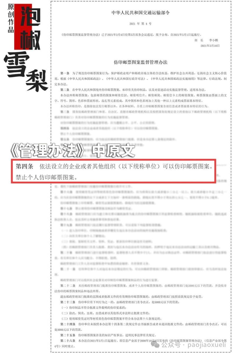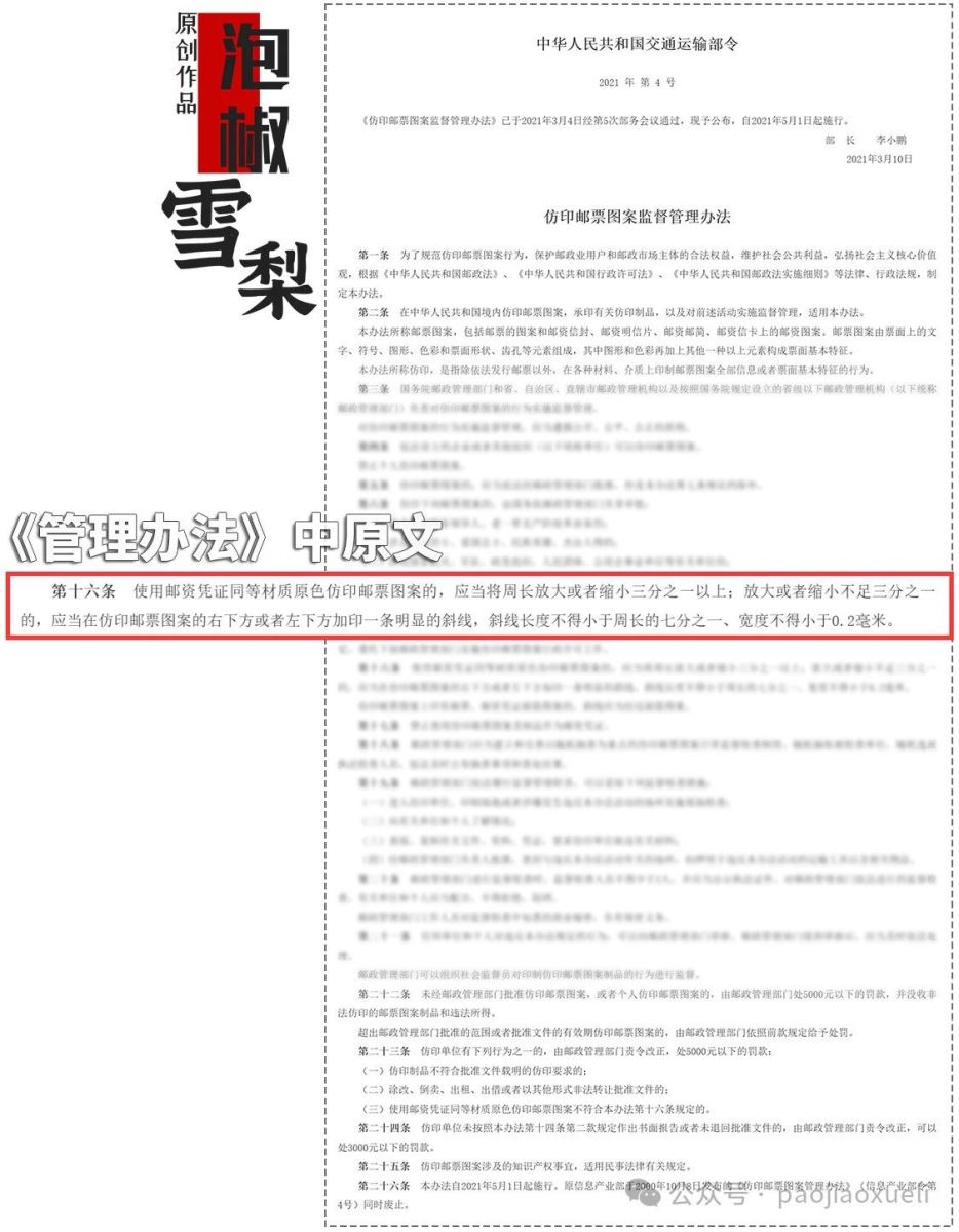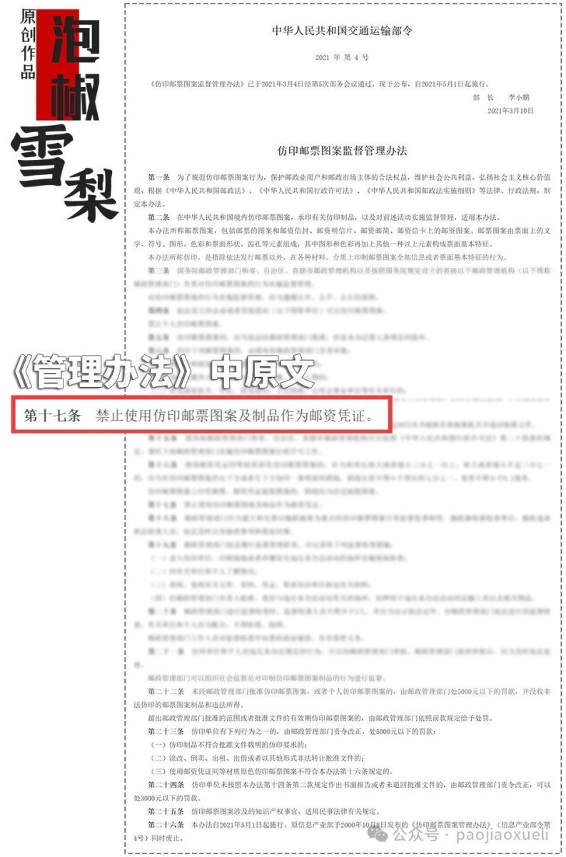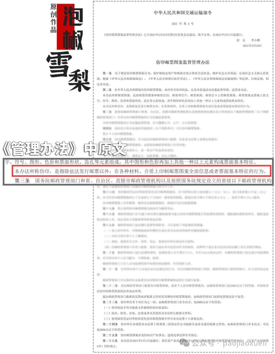 针对邮票图案印刷和使用,中华人民共和国交通运输部曾在2021年3月4日通过了《仿印邮票图案监督管理办法》,其中就对这类印刷品进行了定义: