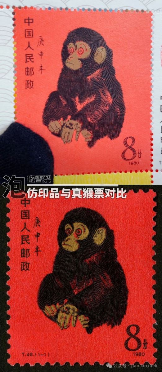 虽然没有拿到仿印品实物无法测量,但从公开的照片上可以看到,仿印品横向齿孔为26个,纵向齿孔为31个,而1980版猴票的横向齿孔为16个,纵向齿孔为19个,无论是纵横比还是实际大小,两者都有很大差距。
