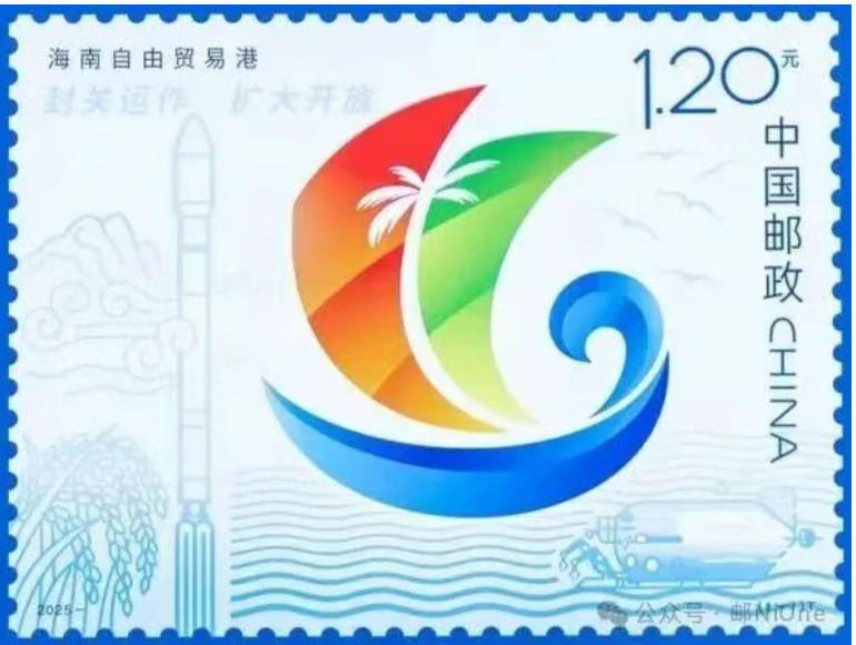 作为2025年新邮发行的“收关”之作,先听听设计师韩秉华对这套邮票的创作介绍——在邮票设计风格上,以简洁的图案化线条构成并以白色底深浅蓝色线条作为背景,巧妙融入海南主题元素,映衬着海南自由贸易港形象标识更显现代感。在标识的周围及背景处,主要展现海南自由贸易港“五向图强”,点缀了五指山、稻穗、火箭、深海勇士载人深潜器、海底光缆等极具海南自贸港特色的代表性元素,构建出动静结合、寓意深远的画卷。文字“封关运作 扩大开放”点明时代背景,增强纪实性与号召力。邮票整体采用开阔的横向视野与流线型构图,寓意自贸港联通世界的开放姿态。邮票画面以“海南自由贸易港形象标识”为主体,左上角表现了“封关运作 扩大开放”宣传语;画面背景围绕“五向图强”,展现出海南自由贸易港在打造新质生产力上迈出了坚定的步伐,寓意海南自由贸易港向着加快建设具有世界影响力的中国特色自由贸易港目标奋勇前进。邮票采用高网线影写印制工艺,使用中黄、深红、天蓝、专蓝、无色荧光黄、原黑六色印刷,色彩饱和,画面细腻,层次丰富。邮票以蓝色为衬底基调,影写工艺的高饱和度和色彩鲜艳度,使得邮票层次更加分明,精准还原了原稿的色彩。用无色荧光黄制作海底数据光缆,在紫外灯照射下,发出黄光,增加了邮票的防伪性和美观性,也增加了邮票的科技感。整版邮票的边饰色彩过渡自然流畅,用无色黄荧光还原灯塔发光的景象,在视觉上更加吸引人,增强邮票整体的美感。方寸之间,见壮阔气象。《海南自由贸易港》特种邮票不仅是地理空间的定格,更是对“高水平开放、高质量发展”的视觉叙事——它讲述的,是一个岛屿如何拥抱世界,一片蔚蓝如何孕育美好的未来。