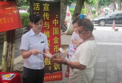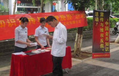 为维护国家法定货币的权威,保障广大消费者的利益,宣传推广中国金币品牌,海南国泉有限公司于6月30日开展了中国金币维权反假宣传活动,活动特选于市民流动性较高的国贸商业地点,以便能更大程度更广范围的帮助市民们树立维权反假意识,掌握辨真识伪技能,坚定收藏投资金银币的信心。