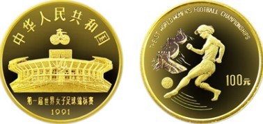 1991年,中国现代金银币“第1届世界女子足球锦标赛”,以贵金属币独特方式,以1金2银3枚的规模,迎来世界足坛巾帼英雄相聚的盛大节日。 “第1届世界女子足球锦标赛”正面图案,金银有别,金是现代建筑天河体育中心,银是传统建筑越秀山望海楼。设计与雕刻,前者是李小川,后者是申宪章。同是沈阳造币厂钱币艺术家,李小川年轻,思想相对活跃,作品也有青春的时尚。申宪章相对恪守传统,作品的风格,更追求严谨与细致。正好是两个相对的素材,不同的思路,不同的技法,最终的效果,也有符合主题的不同的完美。 1金2银3枚纪念币的背面图案,核心设计思路并没有多少突破,仍以运动员造型为主图。不同的是, “单人”、“双人”和“三人”,不是从纯粹足球技术角度,而是通过运动员人数的多寡,来区别3款品种的相异。这种形态,在中国现代金银币“体育”系列中,非常少见。 此外,设计者先入为主的色彩十分浓烈,这种“先入为主”,表现于币面,就是以中国女子足球队队员为中心。币面上的女子球员,单人也好,双人也罢,或是3人,装束上、体形上、神态上,也没有非常明显的区别。国际赛事的特征,在币面几乎找不到有效的痕迹。客观地说,这是设计一大缺憾,主观表达是一个层面,主题表达是一个层面,只有二者有机结合,才能真正展示币面主题的深刻内涵。 金币与银币背面图案的设计,虽虽有相近的地方,但也有明显的区别。其中最典型处,就是金币币面,后置有“长城”背景,而银币,则空无一物。总体来说,无论是金币银币,构图都相对简洁,英文币名“The ist world women’s football championships”环于币面下端,面额或“100元”或“10元”,位于中端右侧。英文与中文字休都瘦长秀丽,与主题的“女性”紧密相扣。(供稿:宁波市金鑫金银饰品公司)