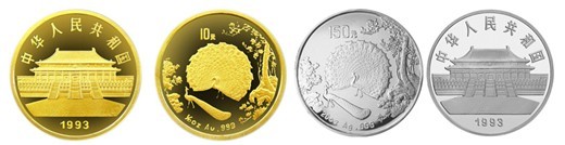《孔雀开屏图》是清代宫廷画画家郎世宁的巅峰之作,用中国画工具,结合西洋画作画方法,形成精细逼真的效果,同时具有前代所有宫廷绘画中所没有的独特风格,是我国美术史上非常重要的作品之一。中国人民银行于1993年发行的中国古代名画系列之《孔雀开屏》纪念币,拉开了中国现代金银币的古代名画题材系列帷幕,推进了中国纪念币的艺术化发展。 |
