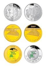 上海世博会是探讨人类城市生活的盛会,是一曲以“创新”和“融合”为主旋律的交响乐,是人类文明的一次精彩对话。中国人民银行已于2009年6月10日发行了中国2010年上海世界博览会金银纪念币(第1组),该套纪念币的面世受到了广大集藏者的热捧。为满足集藏者空前的关注度,中国人民银行定于2010年4月22日发行中国2010年上海世界博览会金银纪念币(第2组)一套,该套纪念币共4枚,其中金币2枚,银币2枚。