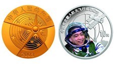 2003年10月15日9时0分,我国自主研制的“神舟”五号载人飞船在酒泉卫星发射中心用“长征二号F”运载火箭发射成功,将中国第一名航天员杨利伟成功送上太空。这是我国进行的首次载人航天飞行,标志着中国载人航天工程取得历史性重大突破,中国成为世界上第三个能够独立开展载人航天活动的国家。为铭记这一振奋人心的历史时刻,中国人民银行于2003年12月29日发行了中国首次载人航天飞行成功金银纪念币一套。该套纪念币共2枚,其中金币1枚,发行量30000枚。银币1枚,发行量60000枚。 |
