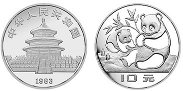 该币1983发行,重为1盎司,处理工艺以镜面抛光、喷砂凝霜为主。币的正面是熊猫母子嬉戏图,画面朴素且充满温情,细看画面,引人无限遐想。该币获得1985年“世界硬币大奖赛”之“世界最佳银币奖”。