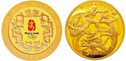 中国人民银行于2008年3月20日发行第29届奥林匹克运动会贵金属纪念币(第3组)一套。该套纪念币共9枚,其中5盎司金质纪念币背面图案为现代体育运动和奥运五环抽象造型,并刊“第29届奥林匹克运动会”中文字样及面额。5盎司圆形金质纪念币为精制币,含纯金5盎司,直径60毫米,面额2000元,成色99.99%,最大发行量为2008枚。 |