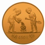 “国际儿童年”下端1/4位置,为“450元”(金币)与“35元”(银币)面额。面额两侧,左为联合国儿童基金会的标志,右为国际儿童年标志。两者都是母亲抱着孩子,但前者是个剪影,衬底背景是一个地球,地球下环橄榄枝,后者为变形图案,也理解为母亲挺举着孩子,也可理解为地球用它的双臂,正细心呵护着儿童。(供稿:宁波市金鑫金银饰品公司)