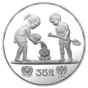 1979年问世的“国际儿童年”,背面图案主要元素有二,其一为精心浇灌花朵的中国男女儿童,其二是国际儿童年标志。币面分上下两个部分,下端三分之二处,以一条横线隔开,主图“精心浇灌花朵的中国男女儿童”在上,副图“国际儿童年标志”在下。当然不是简简单单的横线,而是生满绿草的草坪线。其下端,为斜面的泥土阴影,上为盈盈绿草的肌理。草地上,相对而立的是两个男女儿童,男孩手持铁锹,女孩手执水壶,两人正在精心浇灌的,是盛开为10瓣的花朵。