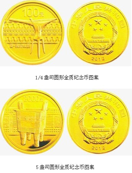 中国人民银行于2012年8月31日发行了第一组青铜器纪念币。该套纪念币共5枚,其中金币2枚,银币3枚,分为正面与背面图案。其中,正面图案有中国国徽,国名、年号。而背面图案造型各式各样,设计各具特色。如:1/4盎司圆形金质纪念币图案为夏代乳钉纹爵,衬以该器物乳钉纹样等装饰组合设计,并有“夏代乳钉纹爵”字样和面额。5盎司圆形金质纪念币图案为商代兽面纹方鼎,衬以该器物兽面纹样等装饰组合设计,并有“商代兽面纹方鼎”字样及面额。这些纪念币,上刻象物,是上古人们崇敬神灵的图腾。蕴含了人们对自然资源敬畏,祈福安康的精神寄托。价值意义深刻,积极影响透彻。