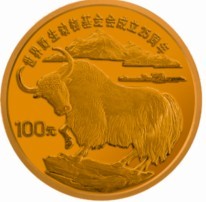 中国人民银行推出的“世界野生动物基金会成立25周年”,共两枚,分别是1/3盎司“牦牛”金币,和22克“大熊猫”银币。背面图案由上海造币厂陈坚、孙奇龄与英国皇家造币厂,以及中国金币总公司朱纯德,联合设计、雕刻,上海造币厂铸造。金币发行量3000枚,银币30000枚。金银币共用的正面图案,中间为庄严的国徽,上环“中华人民共和国”国名,下环“1986”年号,也体现了中国参与这项活动的严肃性。