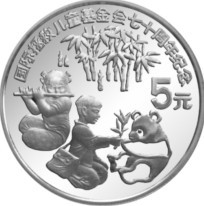1989“国际拯救儿童基金会70周年”,1金1银共两枚。金币背面图案为“放风筝的女童”,银币相对复杂一些,女童之外,又多了一位男童,还加了一只大熊猫。币名也由此繁琐拗口:“吹竹笛的女童和喂熊猫的男童”。银币编号“1989-0802”,精制,重量22克,币面直径36毫米,面额5元,成色90%,发行量25000枚,上海造币厂铸造。相同图案,另外发行有普制银币。 |