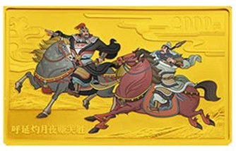 中国人民银行发行的《中国古典文学名著》——《水浒传》(第3组)5盎司彩色长方形彩色纪念金币,该币含金成色99.99%,5盎司,长宽分别为64mm和40mm,面值为2000元,发行量为900枚。该币再现了名著六十三回“呼延灼月夜赚关胜 宋公明雪天擒索超”的画面,讲述的是关公后人关胜领朝廷之命带兵剿梁山后被呼延灼诈降而被擒的事,之后关胜加入梁山共举大义。 |