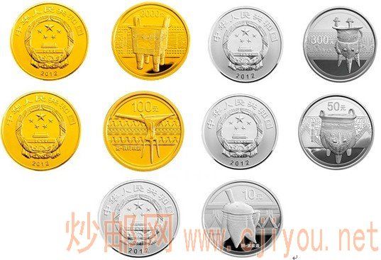 2012年8月31日,中国人民银行发行中国青铜器金银纪念币(第1组),该组纪念币包括5盎司圆形金质纪念币为精制币一枚、1/4盎司圆形金质纪念币为精制币一枚、1公斤圆形银质纪念币为精制币一枚、5盎司圆形银质纪念币为精制币一枚,以及1盎司圆形银质纪念币为精制币一枚。