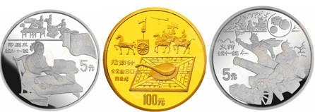 为向世界人民展示我国古代伟大的科技成果,中国人民银行于1992年至1997年发行了5组“中国古代科技发明发现金银铂纪念币”。该系列纪念币,以中国古代科技发明发现为主题,正面图案均为长城、国号、年号;背面图案则为我国古代的各种发明发现,除了四大发明“指南针、造纸术、火药和印刷术”外,还有古代航海造船、地动仪、针灸、龙骨车、纺织机、纸币、天文钟、瓷器等等极具代表性的发明发现。该系列纪念币规格多样,金币有1公斤、5盎司、1盎司、1/2盎司、1/4盎司、1/10盎司;银币有5盎司、1盎司、40克、20克、15克;铂币规格只有1盎司一种。