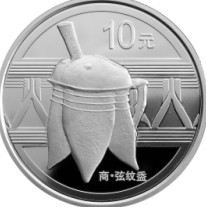 中国青铜器的品种极其丰富,不仅有酒器、水器、食器、兵器、礼器,还有车马器、农具、工具及各类生活用具等一应器物。众多的青铜器皿,造型生动、多彩多姿,令人观赏之余诞生诸多欣慰。该次中国青铜器金银币(第1组)选题的五枚金银币基本都是夏和商中期前的奴隶主贵族祭祀及庆典用器,且均属无铭文礼器。而折射于中国悠长的酒文化历史,则青铜器中以讲究组合论之,表现为商代青铜酒器的品类众多,且制作奢华精美。从品类上说就有爵、角、觚、觯、尊、壶、觥、盉等等,不一而足;从组合上说,盛酒器、斟酒器、饮酒器,甚至和酒器配套组合现象,既见诸典章的记载也有考古实物的出土;而说到精美典雅,庄重气度,无论造型、纹饰以及细节处理都唯美并实用,春兰秋菊各有千秋。