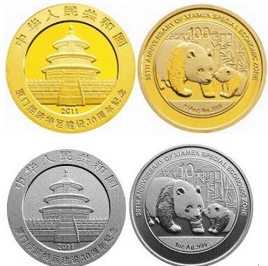 古人说三十而立,2011年11月21日,中国人民银行发行一套厦门经济特区建设30周年熊猫加字金银纪念币,以庆祝厦门经济特区建设30周年。该套纪念币共2枚,其中金币1枚,银币1枚,均为中华人民共和国法定货币。这套厦门经济特区建设30周年熊猫加字金银纪念币由1/4盎司圆形金质纪念币、1盎司圆形银质纪念币这两枚普制币组成。两枚纪念币的正面图案都采用了北京天坛祈年殿,母子熊猫图则是它们的主要背面图案。
