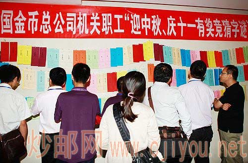 中国金币总公司机关工会举办“迎中秋、庆十一猜谜”活动 日期:2012-09-27 值中秋、国庆佳节即将来临之际,为进一步丰富职工的文娱生活,营造喜庆祥和的节日气氛,中国金币总公司机关工会于9月26日开展了“迎中秋、庆十一猜谜”活动。 「邵长年董事长参与猜谜活动」 「张汉桥总经理参与猜谜活动」 「总公司机关广大职工积极参与猜谜活动」 妙趣横生、怡情益智的竞猜谜语活动得到了总公司机关广大职工的积极关注和参与,邵长年董事长、张汉桥总经理等领导与职工利用工余时间纷纷兴致满怀地开动脑筋、共同研讨,一道道高深的谜题在金币职工面前被逐一解开。(供稿:宁波市金鑫金银饰品公司)
