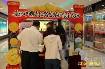 为弘扬青铜器文化,更好的宣传中国青铜器纪念币发行上市, 9月26日,北京全大来金银珠宝有限公司应新奥工美大厦领导邀约,在新奥工美大厦的新光大道上开展为期一个月的“庆祝中国青铜器纪念币发行”宣传活动。