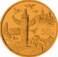 “中华人民共和国成立50周年”两枚金币,形制不同,1/2盎司金币为传统圆形,5盎司金币新颖长方之形。两枚金币取材也各自不同,5盎司金币复制油画《开国大典》,1/2盎司金币“锦绣中华”,与3枚银币取材“坚强柱石”、“民族团结”、“辉煌成就”,同是新中国日新月异面貌大展示。 |