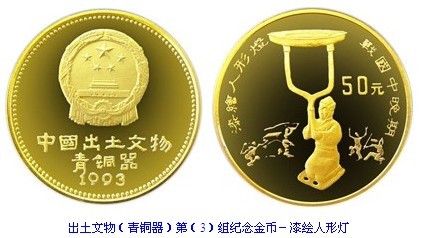 1974年河南三门峡上村岭出土了战国跽坐人漆绘铜灯,这是战国中后期青铜灯中最具代表性的人俑灯。1993年中国人民银行发行了出土文物(青铜器)第(3)组纪念银币一套,其中一枚便是漆绘人形灯金币。