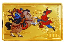 严格地说,现代钱币艺术并非传统意义上的二维平面艺术形式,因为币面上浮雕具有一定高度,较小的幅面就可以表现非常广泛的题材,传承民族文化正统,展现东方古典美学,在简洁明了的构图和浮雕造型中体会到盈满的内涵和思想。“三打祝家庄”五盎司彩金币,设计就很有特点。 |