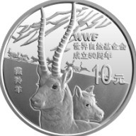 欣赏“世界自然基金会成立50周年”银币,币面图案以一对藏羚羊的头部特写为主形象,远处的一支小规模藏羚羊群及雪山为背景,并刊“WWF”英文字样和“世界自然基金会成立50周年”中文字样及面额。